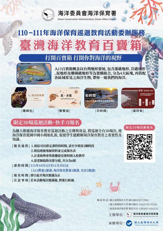 三、 | 檢附本活動海報一份,並請貴校至相關網站(https://reurl.cc/rRY7Wb)報名;如有任何疑問請洽國立臺灣海洋大學嚴小姐(電話 0930-772965)或海洋保育署梁先生(電話 07-3382057 轉分機 262125)。 |
