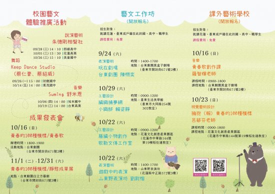 三、 | 課外藝術學校-課程對象:就讀花蓮或戶籍在此的國、高中、職學生,課程費用:免費。 |