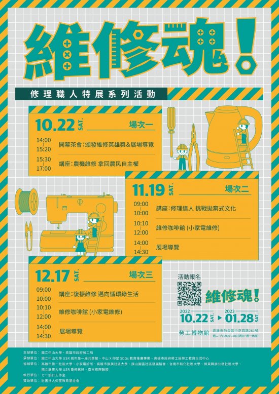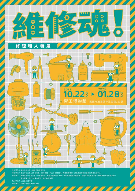 一、 | 本展覽於民國111年10月22日至112年1月28日假高雄市勞工博物館(高雄市前金區中正四路261號)展出,以深入淺出的方式了解維修是循環經濟的一環,與其在當代環境、經濟、社會的多重價值。 |