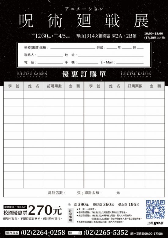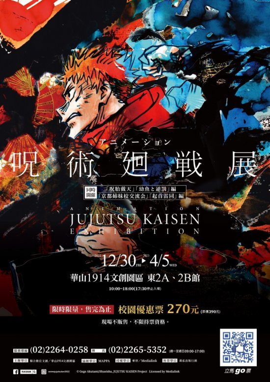 一、 | 為充實國人文化藝術視野、推廣動畫教育、增進國際教育的深度與廣度,本公司特引進日本超人氣漫畫「咒術迴戰」展覽。「咒術迴戰」自2020年改編動畫後引爆全球熱潮,成為現象級動畫大作,於日本巡迴展內容分兩期展出,本次「咒術迴戰展」海外特展集結所有作品,一次完整呈現給台灣觀眾,期待透過包含數百幅原畫、分鏡圖、等身FRP、巨型動畫投影及名場還原等豐富展品,一窺圖像授權產業成功背後的密訣! |