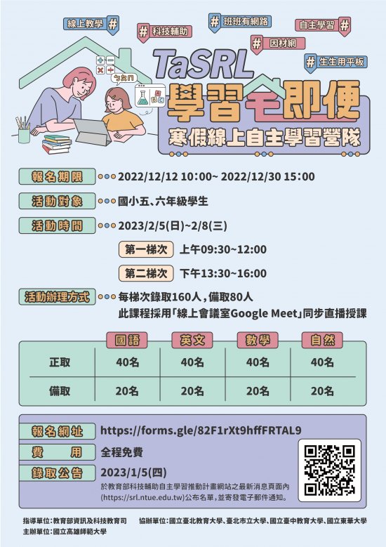 八、 錄取公告:於教育部科技輔助自主學習推動計畫網站之最新消息頁面內(https://srl.ntue.edu.tw)公布名單,並寄發電子郵件通知。