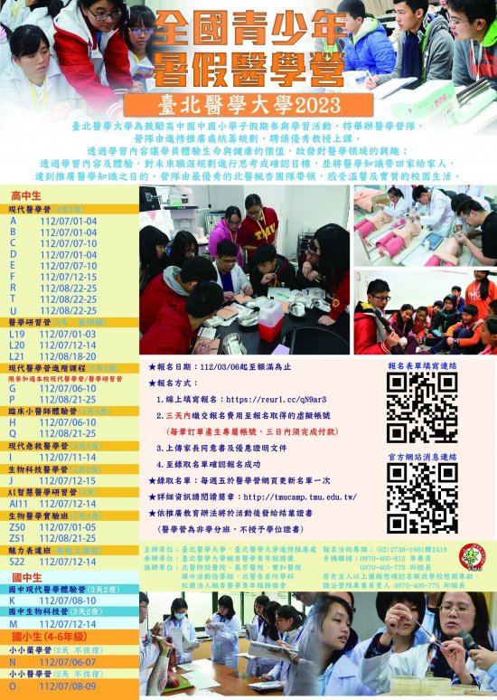 二、 | 營隊資訊:2023暑期醫學營擬訂於民國112年7月1日至8月25日辦理。網址 http://tmucamp.tmu.edu.tw/ |