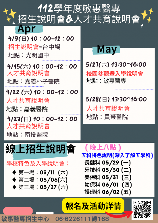 一、 | 本校為五專醫護類學校, 設有「護理科」、「幼兒保育科 、「美容保健科」、「牙體技術科」、「長期照顧與健康促進管理科」,為提供貴校學生及家長了解五專入學管道及升學醫護類科之未來發展。 |