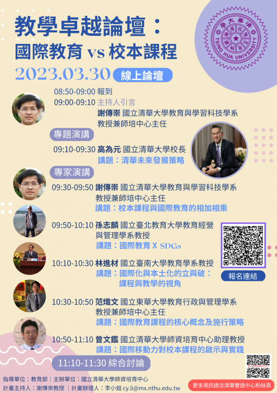 二、 | 旨揭線上論壇以「教學卓越:國際教育 vs 校本課程」為主題,特邀請國立清華大學校長高為元演講,藉由專家學者探索教育理論與實務,期許透過國際教育與校本課程的連結,使學生及學校當局可以立足在地,學習國際、放眼全球,而照亮國際教育的校本課程發展之路,培育學生成為具備全球移動力與競合力之國際化人才。 |
