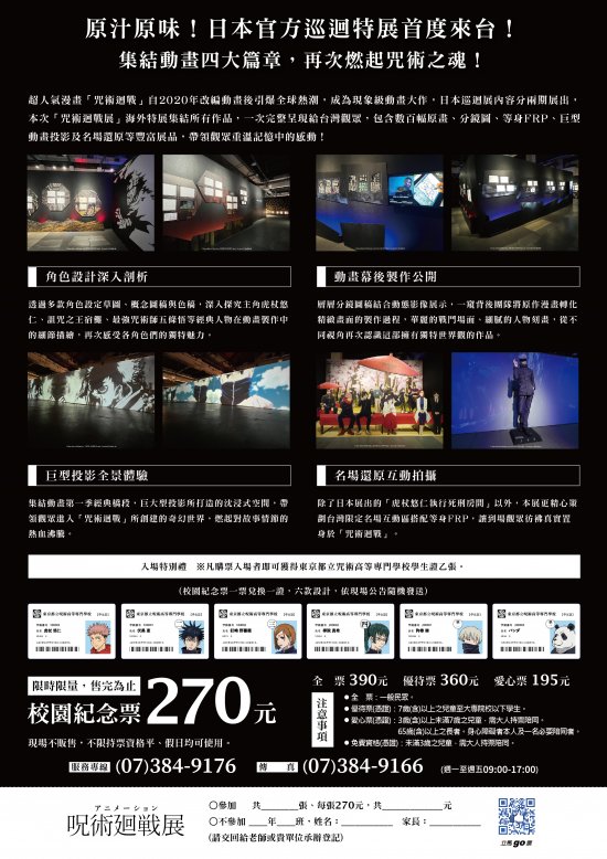 一、 | 為充實國人文化藝術視野、推廣動畫教育、增進國際教育的深度與廣度,本公司特引進日本超人氣漫畫「咒術迴戰」展覽。「咒術迴戰」自2020年改編動畫後引爆全球熱潮,成為現象級動畫大作,於日本巡迴展內容分兩期展出,本次「咒術迴戰展」海外特展集結所有作品,一次完整呈現給台灣觀眾,期待透過包含數百幅原畫、分鏡圖、等身FRP、巨型動畫投影及名場還原等豐富展品,一窺圖像授權產業成功背後的密訣! |