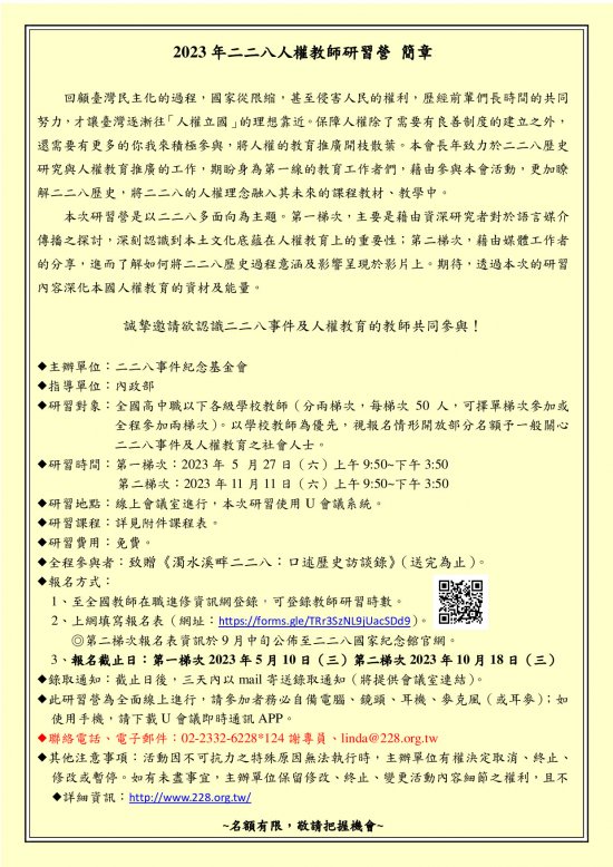 二、 如有未竟事宜,請逕洽該會承辦人,電話:02-23326228分機124,電子信箱:linda@228.org.tw。