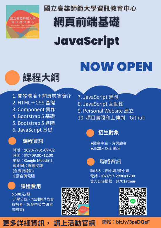(二) | JavaScript 網頁前端基礎課程【國高中線上班】。上課日期 2023/07/01~2023/09/02每週六早上 9:00~12:00 開課,共10堂。 |