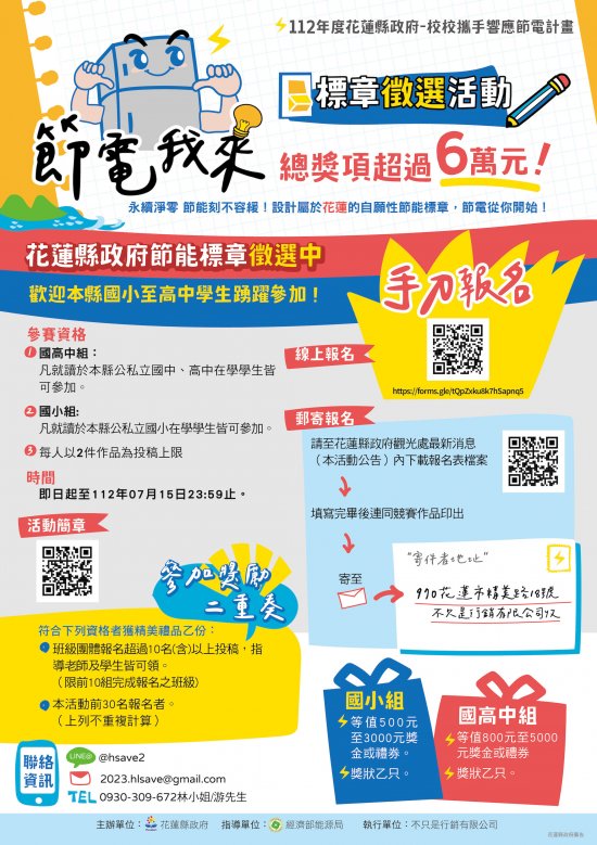 三、本案採線上及紙本兩種方式報名,並分為國小組、國高中 組進行競賽,將針對作品之傳達理念與節能意象、標章美 感、結合花蓮元素程度、創意度、整體完整度作為評選項 目,最優勝之作品則為本年度本縣自主節能標章並張貼於 本縣符合條件之自主節能場所。