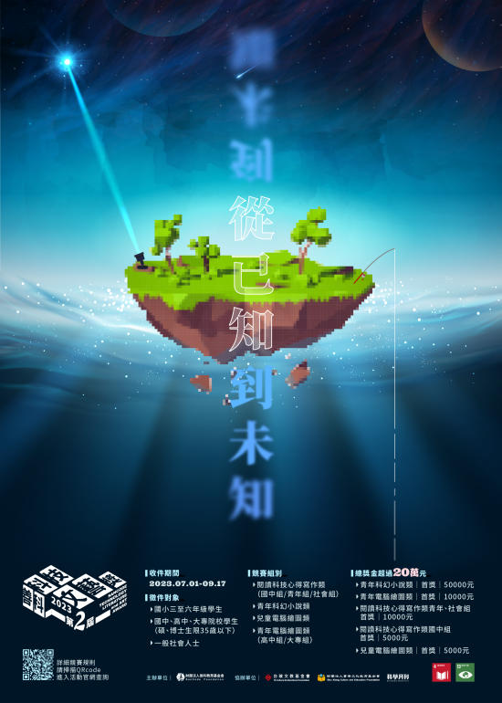 一、 | 本會致力傳播科學知識,以及培養兼具國際觀、社會關懷和科技素養的現代青年。旨揭競賽融合文學與藝術二大領域,鼓勵參賽者(尤其是青年學子)透過不同形式的學習和創作,對科技產生更深刻的理解和興趣,並激盪出令人驚豔的「科文雙融」作品。本(2023)年活動主題為「從已知,到未知」,希望透過學習已知、探索未知,使科技奇點醞釀而生。 |