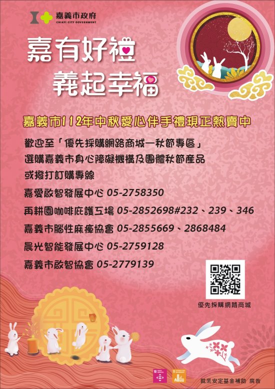 主旨: 函轉嘉義市政府為推廣本市身心障礙福利機構團體及庇護工場所生產之秋節產品,請貴府辦理各項業務或活動時,惠予優先採購其所生產之物品及服務,請查照。