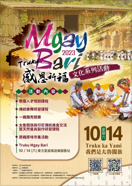 四、 | 活動內容有感恩祈福儀式、傳統舞蹈競賽、百人木琴展演、傳統歌謠傳唱展演、傳統競技競賽、傳統竹屋搭建、Truku文化體驗及傳統手工藝展示售等,相關活動訊息,請逕至本所資訊服務網站( http://www.shlin.gov.tw/ )查詢,或電洽本所文觀課03-8612116分機705王小姐。 |