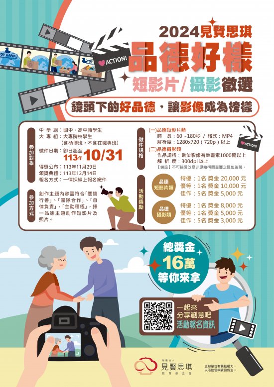 四、 | 檢附「品德好樣」影音攝影徵選活動簡章及海報乙份,報名網址: https://reurl.cc/QENYvq 。相關活動問題請洽該會承辦人:林宜萱社工督導,聯絡電話:(02)2308-0608。 |
