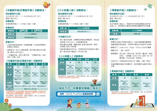 三、 | 本賽事徵件期間自即日起至114年8月31日止,一律採網路報名,報名網址:https://story.funpark.com.tw/。各組徵件對象及參賽資格說明如下: |